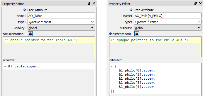 For example, the free attribute initializer shown on the left-hand side of the Free Attribute Property Sheets above generates the following code (directive $define${AOs::AO_Table}):