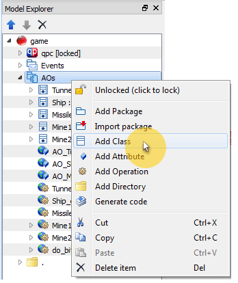 A Class can only be added to a Package. To add a Class, in the Model Explorer right-click on the Package to which you want to add a new Class and select Add Class from the popup menu.