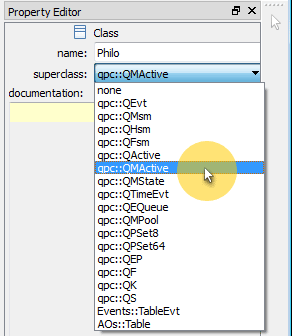 A class can optionally inherit a superclass. A superclass can be any of the already defined classes, which specifically include classes provided in the QP Framework Item. The following screen shot shows an expanded drop-down box of existing classes, from which you can choose the superclass. Please note that the classes listed in the drop-box use the Fully-Qualified Names, that is, names that are prefixed with the package name(s), such as qpc::QActive.