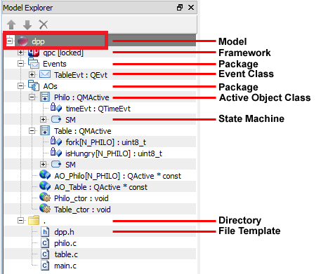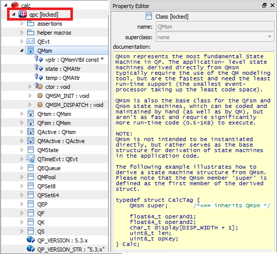 The qpc, qpcpp, qpn model item contains a quite detailed and documented model of the selected QP™ framework, which you can use as a quick reference. For instance, you can check the signatures of various functions, macros, etc. You can also copy-and-paste the provided code examples into your own code anywhere in the editable parts of the model (see also Working with Code Editors).