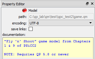 qpc, qpcpp, or qpn) that provides you with foundation classes for derivation of your own classes, such as active objects, state machines, time events, etc. (NOTE: The QM™ Model is always based on one of the QP™ frameworks).The Model Item can be configured by the Model-Specific Property Sheet.
