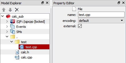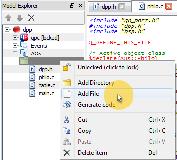 $file${..} vvvvvv and $endhead${..} ^^^^^^^ should not be edited manually. $define${SMs::Calc}$define${..} vvvvv and $enddef${..} ^^^^^^^^ should not be edited manually. "$...vvv" and "$end...^^^" should not be edited, because they will be re-generated and any edits in these sections would be lost.The file items can only exist inside a directory item, which determines the location of the file relative to the QM Model File. Therefore, to add a new file item, you first need to select the directory item in the Model Explorer. Then right-click on this directory item and select the "Add File" in the popup menu, as shown below: