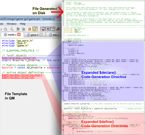 QM also supports External Files, which combine user-code with the generated-code and possibly Code-Generation Directives. This merging of a file-template with generated-code is achieved by clearly delimiting the generated-sections with special comments. Such External Files can be edited inside any editor/IDE of choice and are not editable inside QM. The following listing shows an example of an External File on disk (the comments after the listing explain the interesting lines of code):