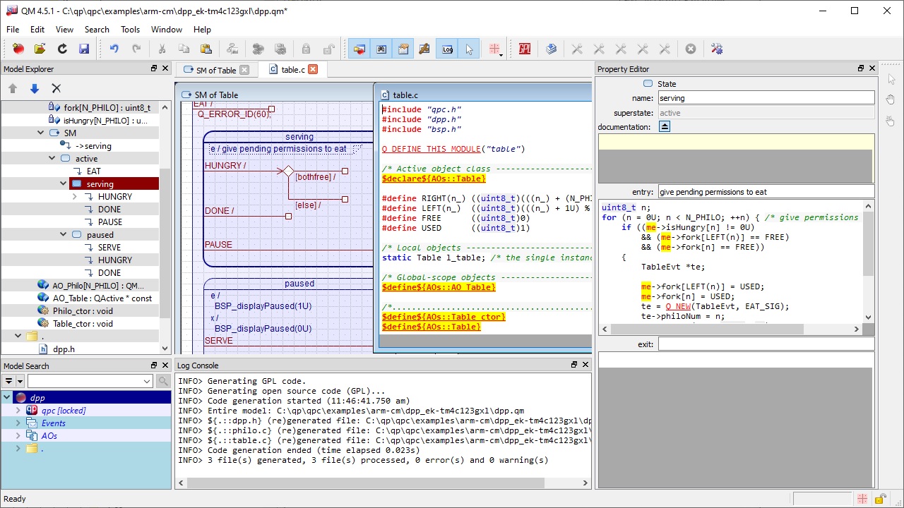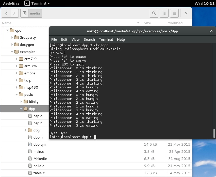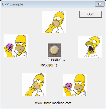 The Dining Philosophers Problem (DPP) application is used in most QP™ examples for various processors and operating systems. This example application is described in the Application Note "Dining Philosophers Problem (DPP) Example".