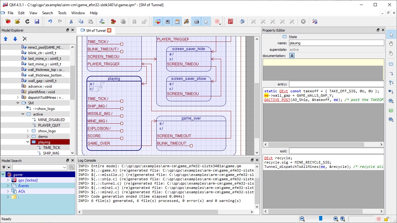 Most QP™ example application contain the QM™ models (.qm) that you can open in the QM™ tool to explore, and modify. For example, the following screen shot shows the model game.qm opened in QM.