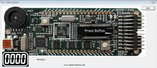 The "Fly 'n' Shoot" game example demonstrates several state machines (active objects) executing concurrently to realize a simple game. This example application is described in @webref{doc/PSiCC2.pdf,Chapter 1 of the Practical UML Statecharts in C/C++, 2nd Ed. book}, which is available online in the book excerpts.