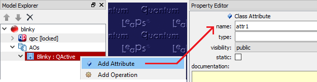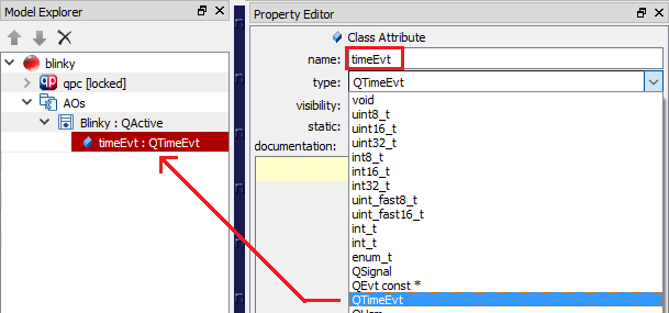 Next, you need to add a Time Event attribute that will deliver the periodic stimulus to trigger blinking in your Blinky state machine.