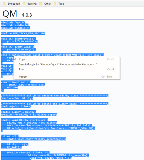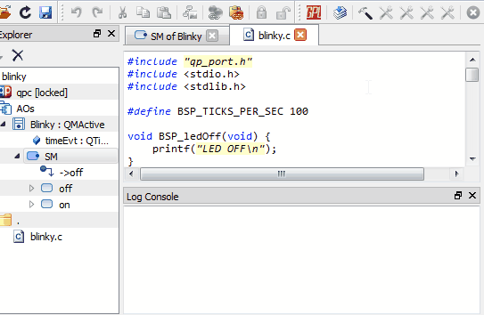 At this point QM™ has generated the blinky.c file in the same directory as the blinky.qm QM Model File. You can inspect the generated blinky.c file on the disk with your favorite code editor.