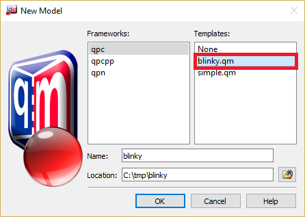 Alternatively, you can create the Blinky model from the provided Template. As shown in the screen shot below, you select the blinky.qm Template in the New Model dialog: