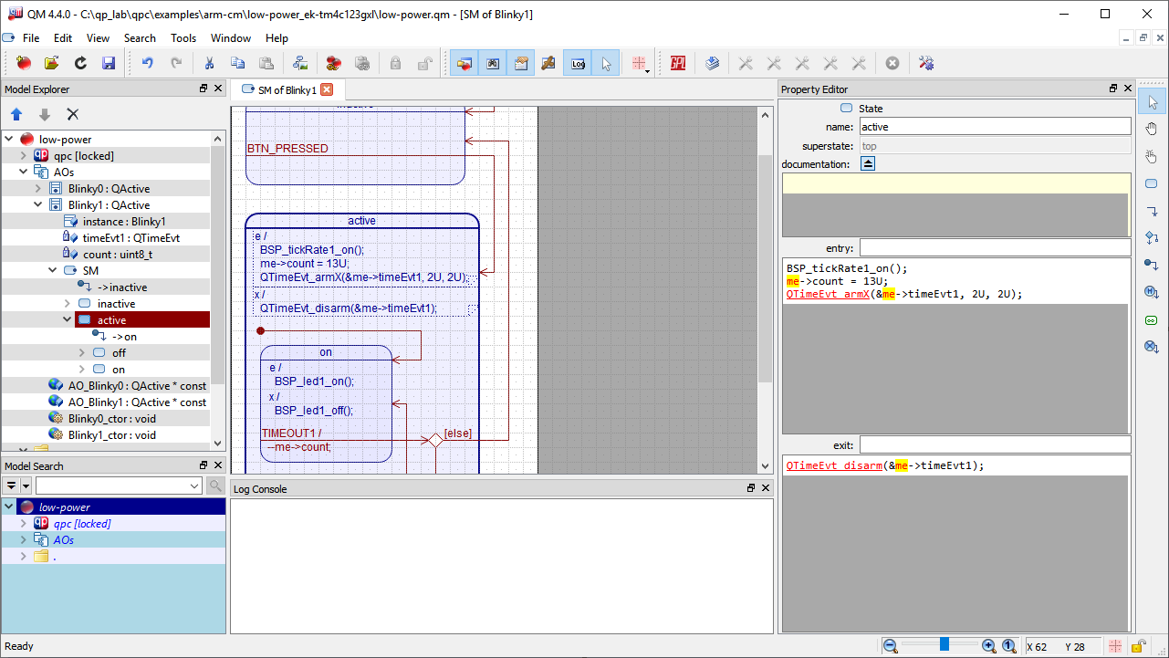 Compared to most other "high ceremony" modeling tools on the market today, QM™ is much simpler, code-centric, and relatively low-level. This characterization is not pejorative. It simply means that QM™ maps the design unambiguously and directly to C or C++ code, without intermediate layers of "Platform-Independent Models" (PIMs), "Platform-Specific Models" (PSMs), complex "Model-Transformations", or "Action Languages". All actions executed by state machines are entered into the model directly in C or C++.