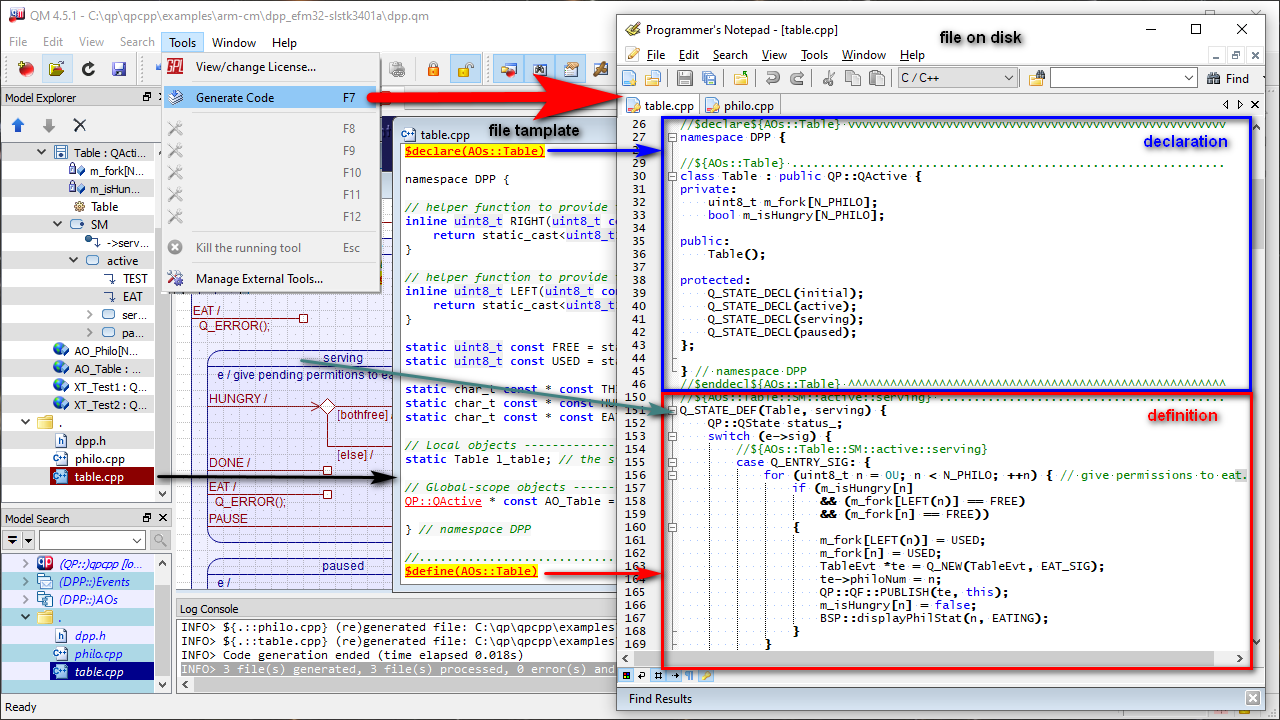 As most other tools capable of code generation, the models you create with QM™ are based on an event-driven Real-Time Embedded Framework. This is because such a framework provides well-defined "framework extension points" designed for customizing the framework into applications, which in turn provide well-defined rules for generating code.