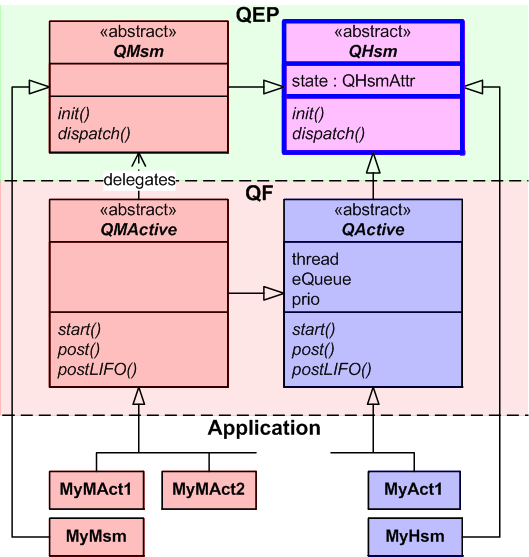 The QHsm and QActive classes from the class diagram above implement the The QHsm/QActive-Style Implementation Strategy that was originally designed for manual coding of HSMs, but now can also benefit from automatic code generation by QM™