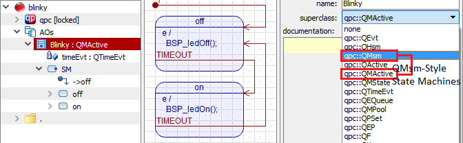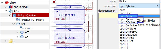 The screen shot below shows how to select the superclass property of your state-machine/active-object class in the Class Property Sheet, so that it uses the QMsm/QMActive-Style state machine implementation strategy: