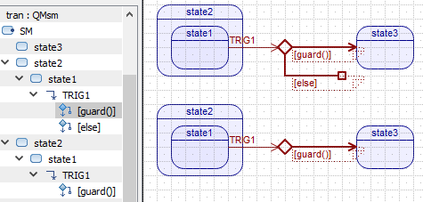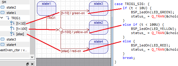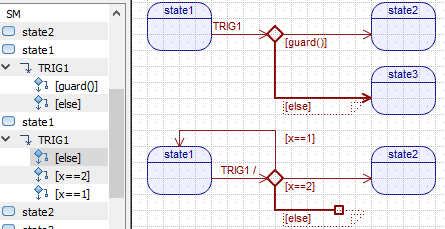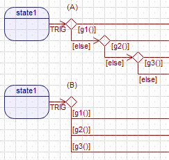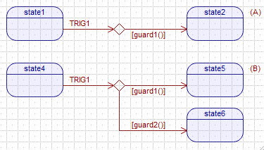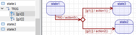 Often in state machines, you need to take a state transition only when a specific condition (called guard condition) evaluates to TRUE at run-time. Also, quite often, you need to transition to different states, depending on the outcome of some guard conditions evaluated at run-time.