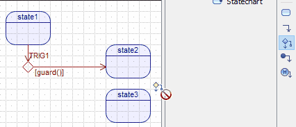 You can also add a choice segment that will become an internal transition with a guard. To do this, you simply drag the end of the choice segment and drop it not on any state edge. At this point, the choice-segment will become an internal transition. Internal transition is executed entirely within the source state and never leads to a change of state.