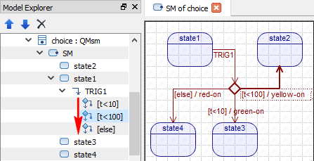 The UML specification requires that the guard conditions attached to the same choice pseudostate be mutually complementary, so that the order of evaluation of the guards does not matter. While keeping the guards complementary is still recommended in QM™, the tool evaluates guards always in the predetermined order, which you can rely on.