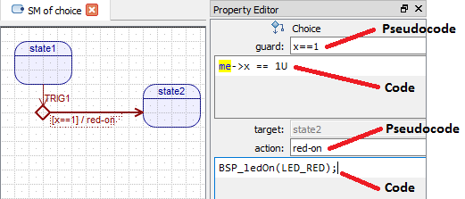 The action property consists of two entries: pseudocode and code (see Choice Property Sheet). Only the code part of the action property is relevant for the code generation. The pseudocode field is designed only to be displayed in the diagram to avoid clutter by minimizing the amount of text to display next to the transition shape.