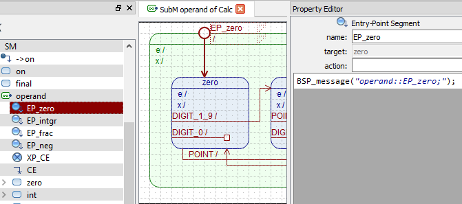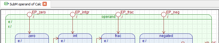 In most UML tools, the process of drawing entry-point transitions consists of first adding an Entry-Point pseudostate (empty circle) and then attaching a transition between it and some state. In QM™ this process is simplified, because the Submachine Toolbox contains a ready-to-use Entry-Point Segment tool, which combines an "Entry-Point pseudostate" with a transition attached permanently to it.