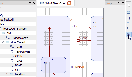 In QM™, however, this process is simplified, because the State Machine Toolbox contains a ready-to-use History Segment tool, which combines a "history pseudostate" with a transition to the "default substate" permanently attached to it.