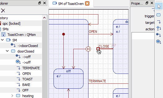 To attach a transition to a given history connector, select the desired transition and hover your mouse over its end (this can be either a regular transition , or an internal transition ). Once the mouse pointer changes to a hand, you can drag the transition end to the history connector. When you are over the history connector, the cursor changes into a circle with letter 'H' in it. At this point you release the left mouse button to "drop" the transition end on the history connector. As mentioned above, you can attach multiple transition ends to a given history connector.