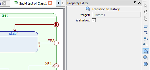 The Is shallow property specifies the type of the transition to history. When the checkbox is unchecked, the history transition is to deep history, which is indicated by the circled (H+). When the checkbox is checked, the history transition is to shallow history, which is indicated by the circled (H).