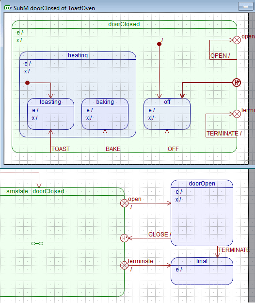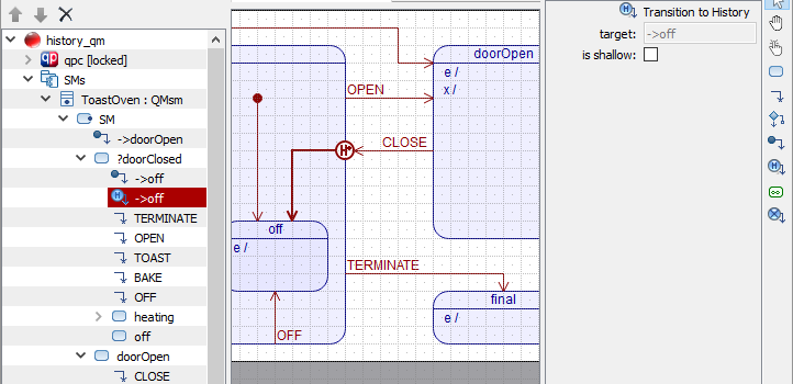 H) is a shorthand notation that represents the most recent active direct substate of its containing state. A transition coming into the shallow-history vertex (called a transition to history) is equivalent to a transition coming into the most recently active direct substate of a state.H*) is similar to shallow-history except it represents the most recent leaf-substate of the composite state.QM™ supports directly the "transition to history" feature for all QP framework types (qpc, qpcpp, and qpn) as well as both QHsm-style state machines and QMsm-style state machines. Also, starting from version 4.0.0, QM supports both the deep history transition type denoted as a circled letter (H+) and the shallow history transition type denoted as a circled letter (H).
