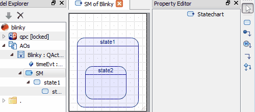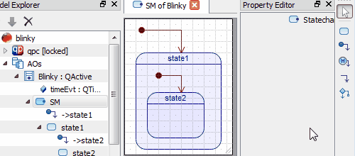 In most UML tools, the process of drawing such initial transitions consists of first adding an initial pseudostate (black dot) and then attaching a transition between it and some state. In QM™ this process is simplified, because the State Machine Toolbox contains a ready-to-use Initial Transition tool, which combines an "initial pseudostate" with a transition attached permanently to it. This tool is used to add both the top-most initial transition and initial transitions nested within superstates.