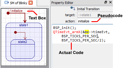 An action is considered defined if the corresponding pseudocode or code boxes in the Initial Transition Property Sheet are not empty. Once an action is defined, it is shown in the text box associated with the Initial Transition (following the forward-slash / character).