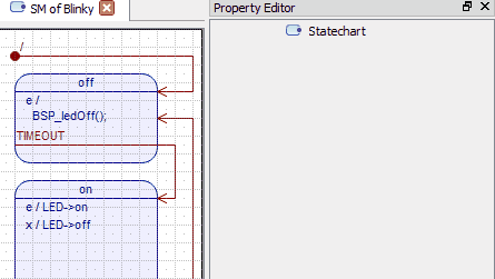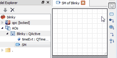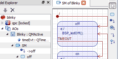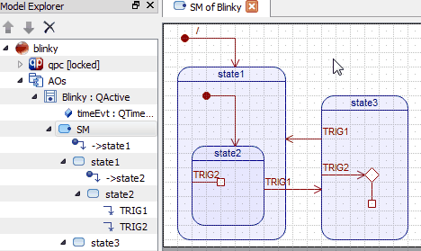 QM™ determines state nesting by the geometric arrangement of states in the diagram, whereas state nesting is determined only by the position of the top-left corner of the state rectangle. This state hierarchy is immediately reflected in the hierarchical model view in the Model Explorer dock window.