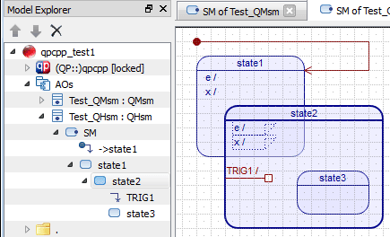For example, the screen shot above shows state2 nested in state1, as identified clearly in the Model Explorer on the left of the picture. Please note that only the upper-left corner of state2 is inside state1, instead of being entirely enclosed by state1. On the other hand, state state3 nests entirely inside state2, and indirectly in state1 as well.