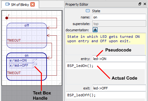 The actual algorithm QM uses to display action text in the entry box is as follows: If both the pseudocode and code entries in the State Property Sheet are empty, the corresponding entry action is considered undefined and is not displayed at all in the state shape. If the pseduocode entry is not empty, regardless of the contents of the code entry, the pseudocode is displayed in the same line as the e/ (entry) text. Finally, if the pseudocode is empty, but the code entry is not empty, the code is displayed in the entry text box of the state shape, however, the actual code is displayed in a line below the e/ text. Of course, to see the text, you need to expand the entry text box in the state shape.