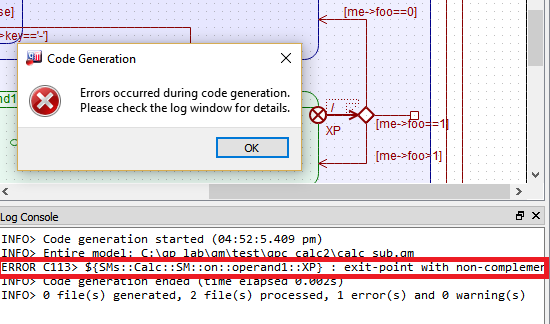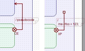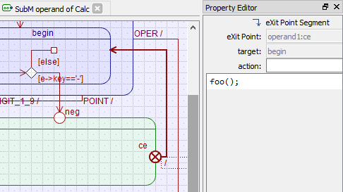 An eXit-Point Segment can have an optional action property, which consists of two entries: pseudocode and code (see Transition Property Sheet). Only the code part of the action property is relevant for the code generation. The pseudocode field is designed only to be displayed in the diagram to avoid clutter by minimizing the amount of text to display next to the transition shape.