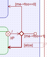 An eXit-Point Segment, just like a state transition, might have choice segments attached to its end. However, an important limitation for eXit-Point Segments is that the choices must be complementary, meaning that you must use the else guard to complement any other choices attached to the end of an eXit-Point Segment. For example, the screen shot below shows an eXit-Point Segment with complementary choice segments:
