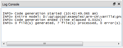 The Log Console also displays output from any External Tools that you invoke directly from QM™ (such as make, lint, unit tests, flash programmers, etc.)