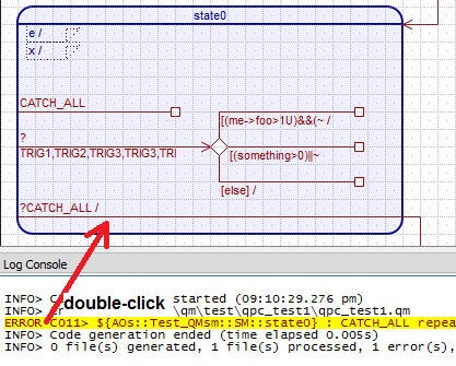 The QM™ code generator might report errors to the Log Console. Typically, an error message pertains to a specific model item. In that case, the Error Console allows you to quickly navigate to the erroneous item by double-clicking on the error message. For example, the screen shot below shows an error message associated with a state item. Double-clicking on the line with the error message opens the corresponding state machine and locates the erroneous state.