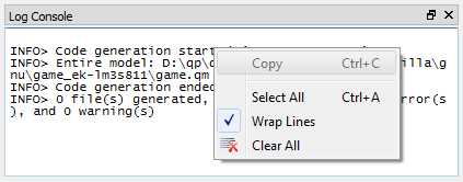 The Log Console provides a pop-up menu, which you activate by right-clicking anywhere inside the text area.