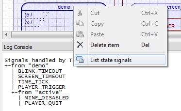 The Log Console also can display additional information about the model, such as all signals handled by a state in a Hierarchical State Machine (HSM).