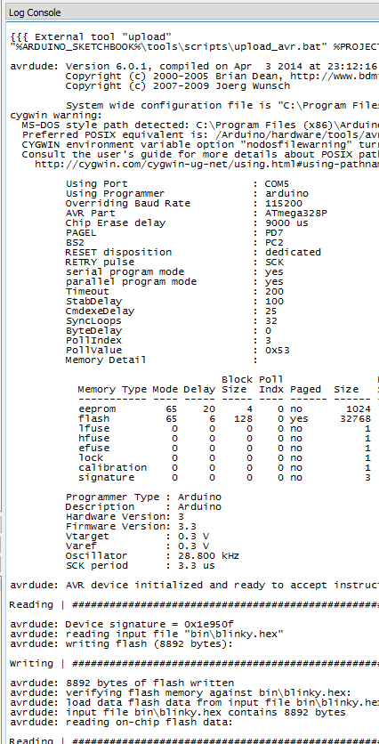 For example, the following screen shot shows the output from a code upload to an embedded target. Please note that this example shows a "long-running" utility, which produces the output incrementally as the code is being uploaded and programmed to the flash memory of the embedded MCU.