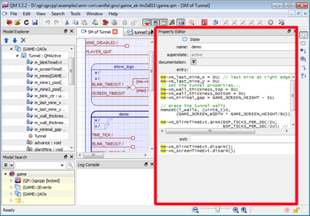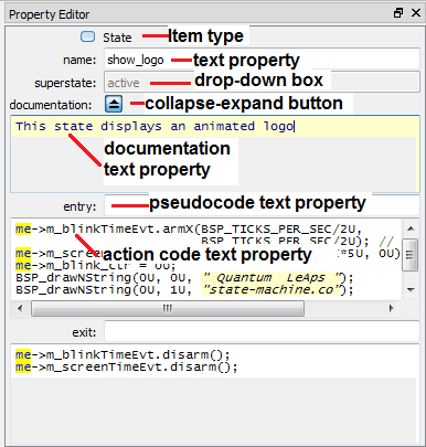 The Property Editor dock window contains the Property Sheet, which is specific to the type of the Current Item and enables you to modify any textual properties of the Current Item, such as its name, documentation, code, etc. The Property Editor dock window can be shown or hidden by means of the menu or through the View Toolbar :