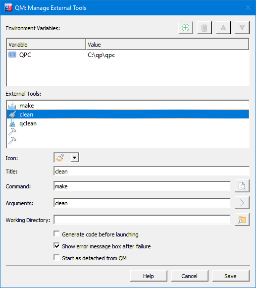 The Manage Tools dialog box allows you to configure up to 5 different external tools that can then be launched directly from QM™ with the keyboard shortcuts through . Examples of external tools include make to perform a software build, lint to statically check your code, your own unit tests that run on the host computer, or a command-line tool to download the code to the embedded target, directly from QM with just one key press. The output generated by the external tool will appear in the QM's Log Console.