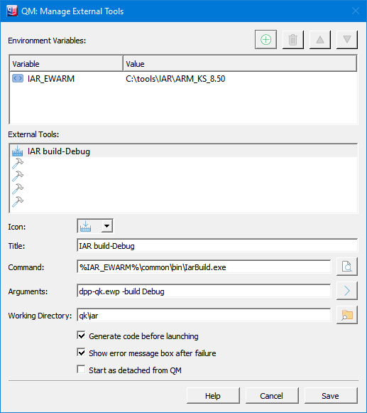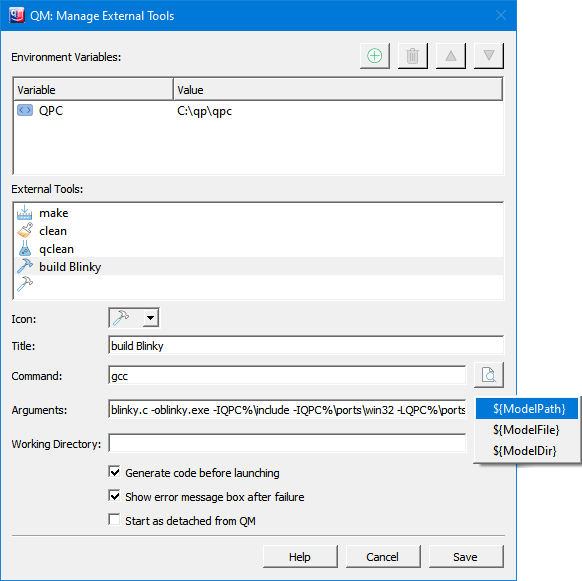 build Blinkygcc (this assumes that gcc is on the PATH)blinky.c -oblinky.exe -IQPC%\include -IQPC%\ports\win32 -LQPC%\ports\win32\mingw\dbg -lqp. (model directory)${ModelPath}, ${ModelFile}, and ${ModelDir}.Many mature embedded toolsets support building projects from the command-line, because only such builds can be truly automated. For example, the popular IAR Embedded Workbench toolset supports command-line build of the projects through the IarBuild.exe utility. The following screen shot illustrates how to set up an External Tool to build an IAR project.