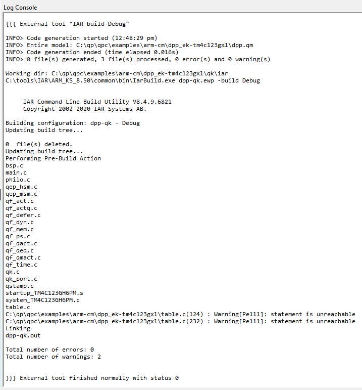 The following screen shot shows the QM™ Log Console output from building an IAR project.