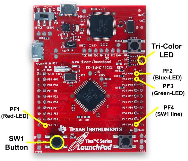 So, depending when the SW1 switch is pressed, you can have only Green-LED blinking, or both green and blue blinking at different rates. The Red-LED appears to be on all the time.