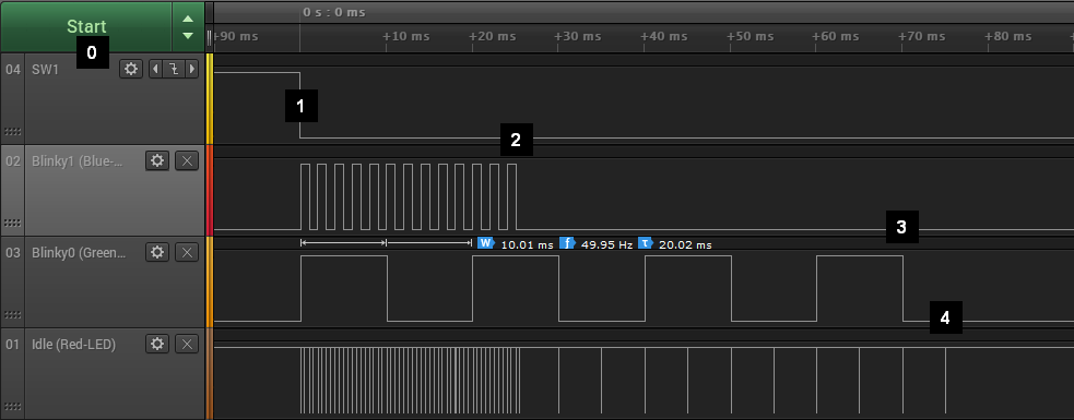 When your press the SW1-Button, the Green-LED starts blinking as before, but additionally, the Blue-LED starts blinking rapidly for 13 times (1/10 of a second on and 1/10 off).