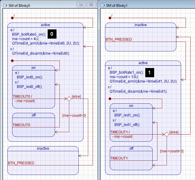 The versions of this low-power example for the QK and QV kernels use two active objects Blinky0 and Blinky1, which toggle the Green-LED at the slow tick rate 0, and the Blue-LED at the fast tick rate 1, respectively. The state machines of the Blinky0 and Blinky1 active objects are shown below: