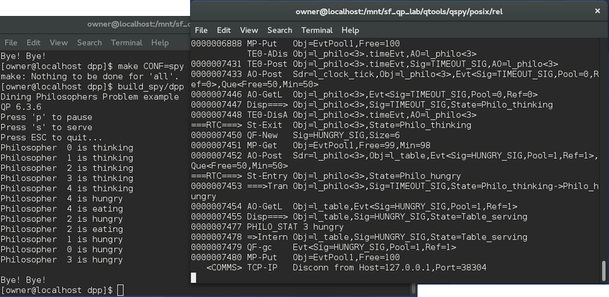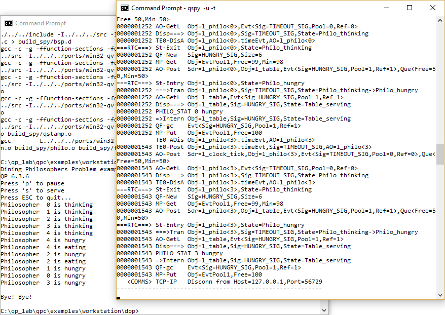 This configuration is built with the QP's Q-SPY trace functionality. The QP/Spy output is performed by a TCP/IP socket and requires launching the QSPY host application with the -t option. To build this configuration, type: