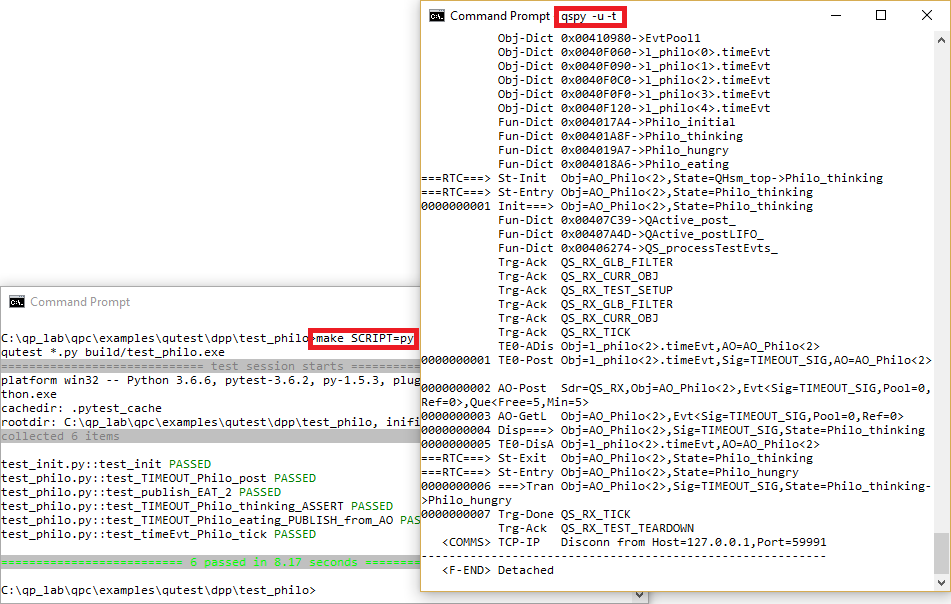 To test the code on an embedded board, you need to connect the board to the host computer and launch the and launch the QSPY host application with the -c COM<n> command-line option, where <n> is the specific COM port number on your host that the board is using.