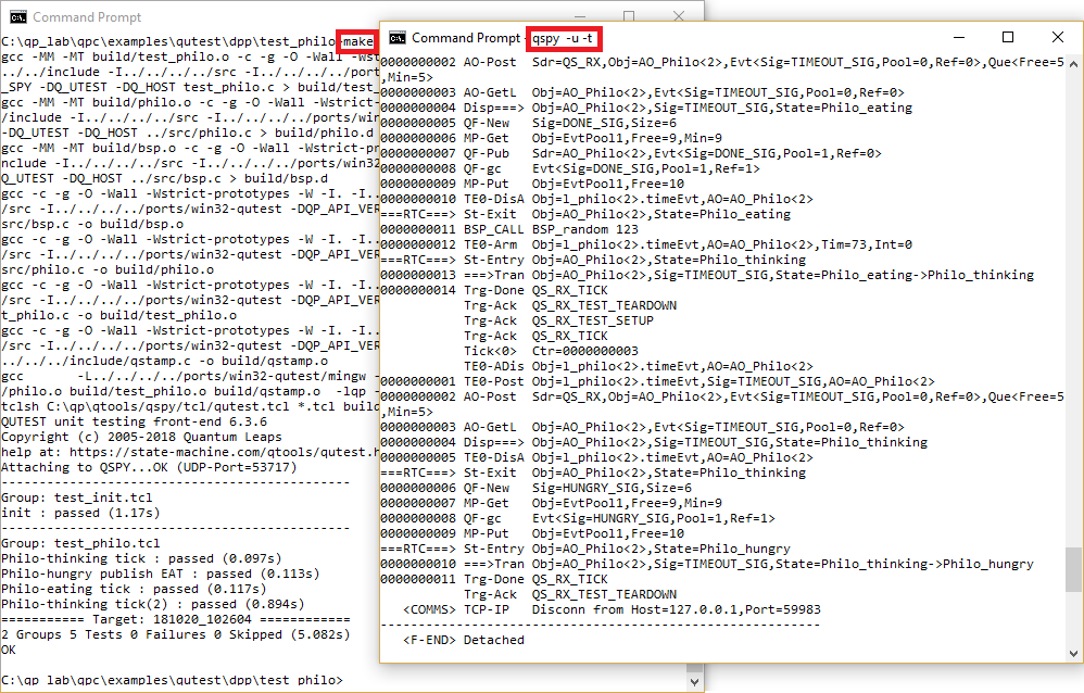 Typically, you start testing on your host computer. Before building/running the code, you need to open a terminal window and launch the QSPY host application with the -t command-line option.