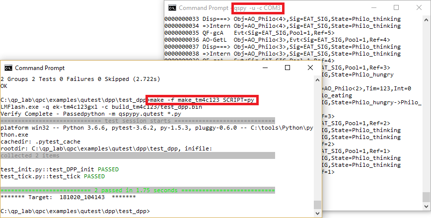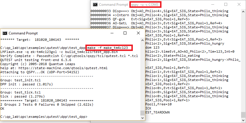 The QUTest testing system allows you also to easily test the code directly on the embedded target board. The dpp/test_dpp/ directory illustrates this option by providing the makefiles for embedded boards, such as the TM4C123 (Tiva LaunchPad) make_tm4c123.