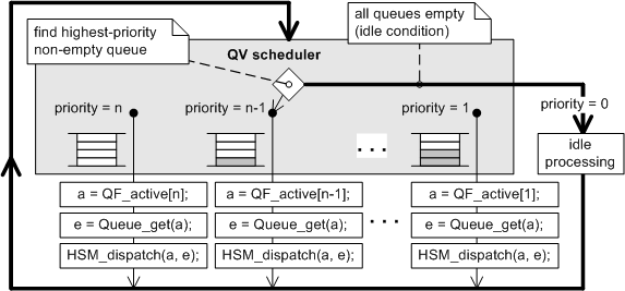 The QV scheduler is engaged after every RTC step of any active object to choose the next active object to execute. The QV scheduler always chooses the highest-priority active object that has any events in its event queue. The QV scheduler then extracts the next event from this queue and dispatches it to the state machine associated with the active object. The state machine runs to completion, after which the QV scheduler runs and the cycle repeats.